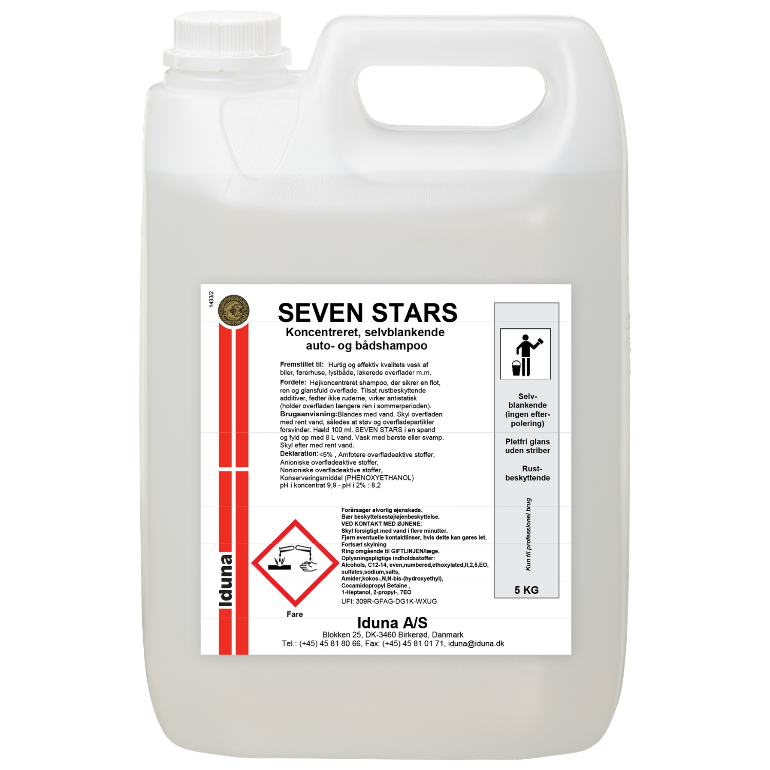 Seven Stars autoshampoo  med voks fra Iduna er udviklet til professionel manuel vask af køretøjer, hvor der stilles krav til effektiv rengøring og kontrolleret kemi. Shampooen løsner og fjerner effektiv snavs.